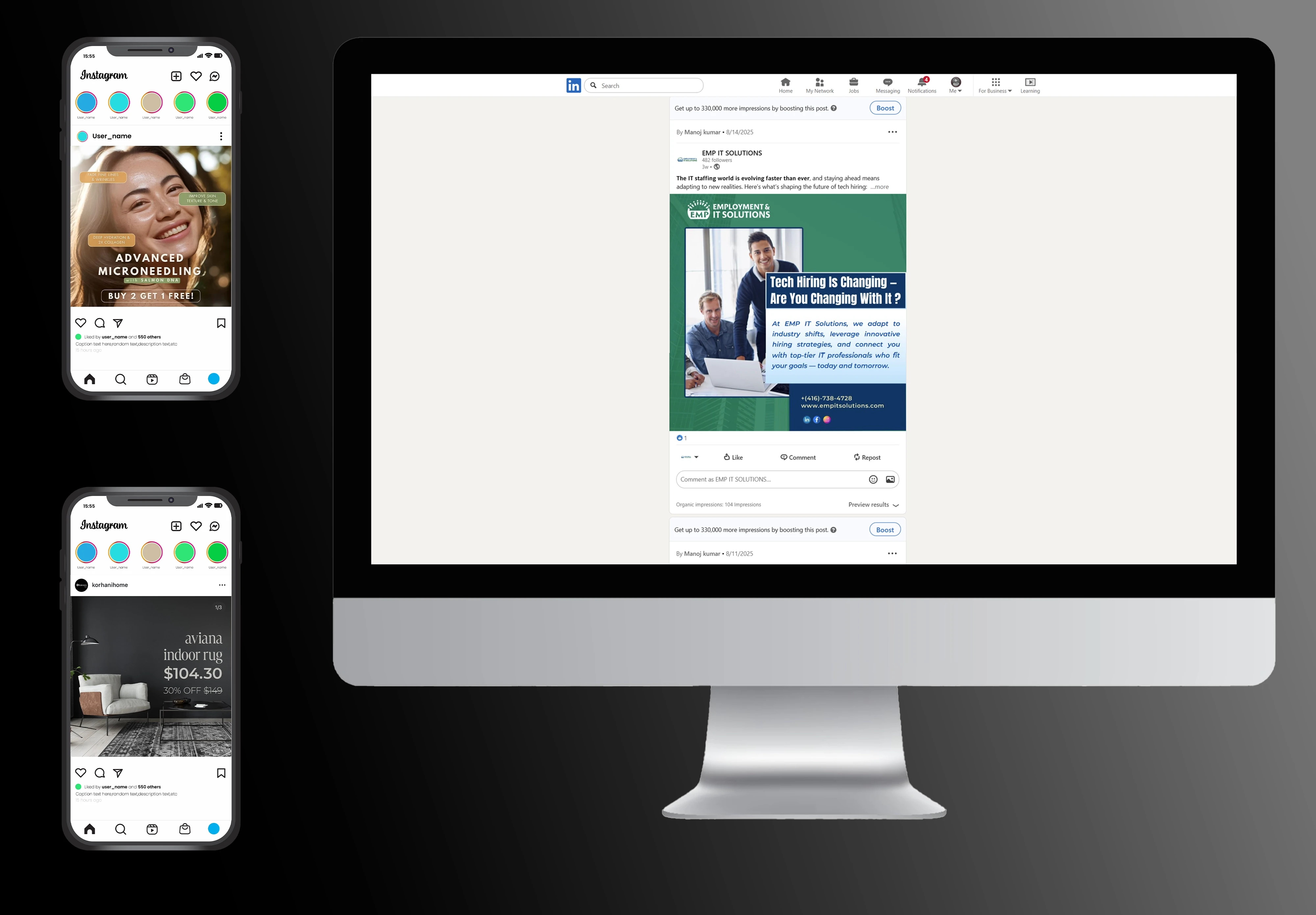 We’ve designed and managed ad campaigns across nearly every major social media platform, helping brands connect with their audiences in meaningful ways. From lifestyle-driven visuals for Korhani Home on Instagram and Facebook, to targeted promotions for Grovehill Lawncare on Google and Instagram, to awareness campaigns for medspas across North America, our work spans industries and audiences. We’ve also delivered professional, results-focused campaigns for Career Pursuit on LinkedIn and Instagram, as well as EMP IT Solutions on LinkedIn—each tailored to the platform and client’s goals.